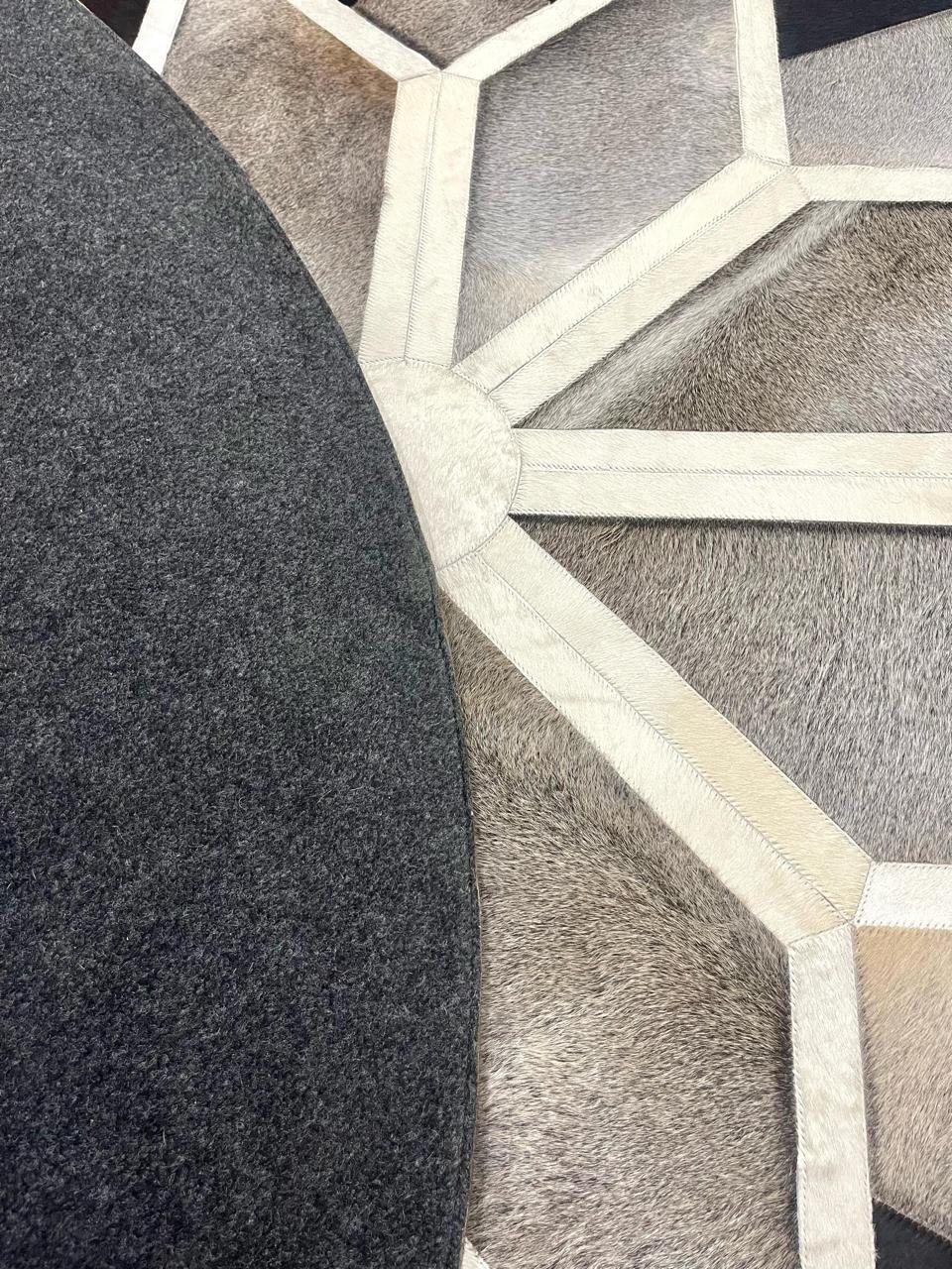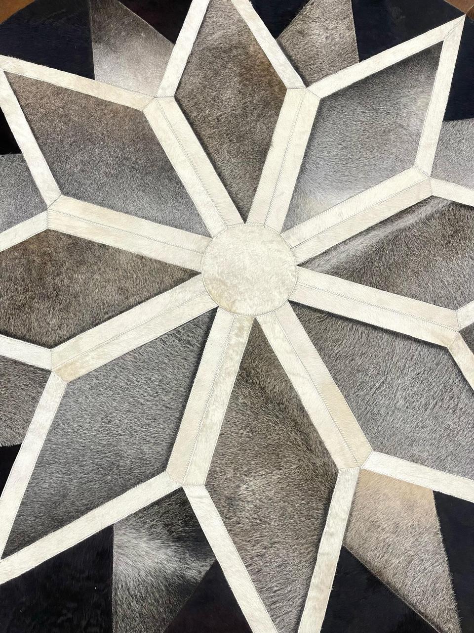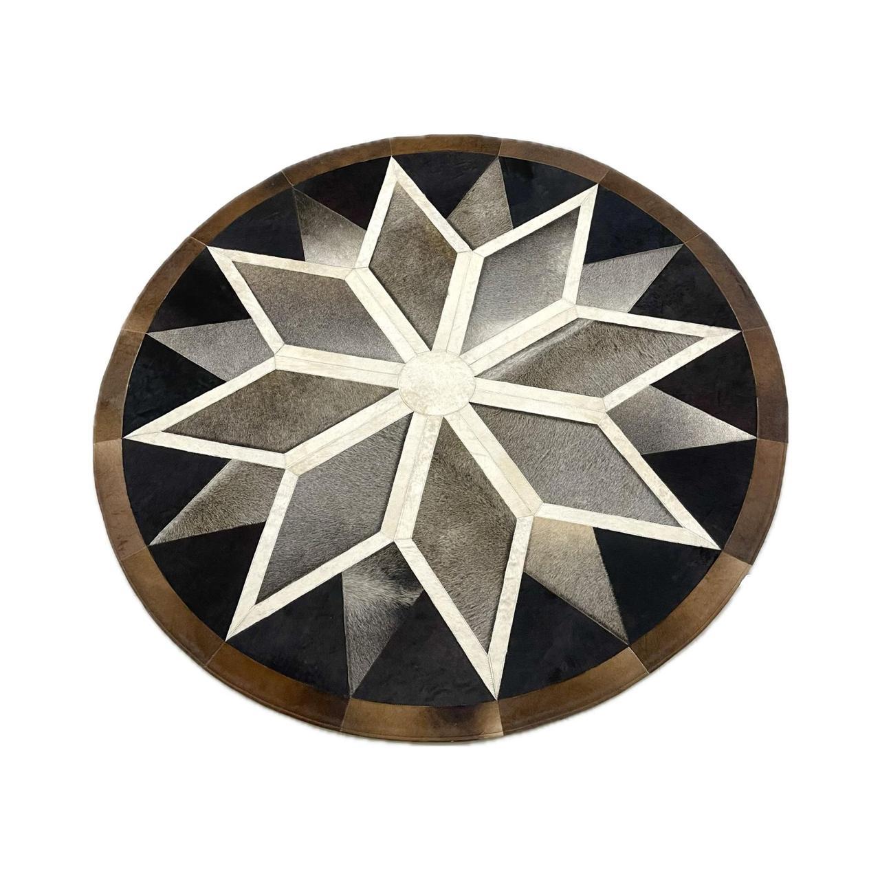 Enhance your interior with this machine-crafted round leather patchwork rug, made from high-quality bull leather and precision-stitched for consistency and durability. The geometric star-inspired pattern offers a bold yet timeless appeal, making it an excellent centerpiece for living rooms, offices, lounges, and refined interiors.